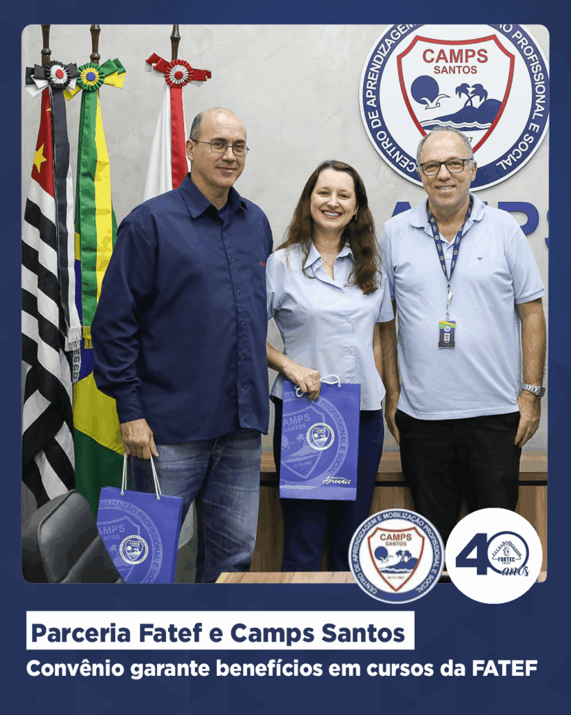 Temos orgulho em anunciar a parceria entre o CAMPS Santos e a FATEF, oficializada na última semana com a assinatura de convênio que garante descontos especiais nos cursos de graduação e tecnólogos: Sistemas de Informação (BSI), Automação Industrial (TAI), Engenharia Elétrica, Engenharia de Produção, Administração, Logística e Pedagogia.